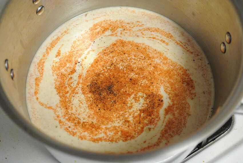 - Then add your cream, broth (chicken, beef, veggie, doesn't matter), and water. Let this come to a boil. You may season in this step, we used plenty of salt, pepper and paprika.