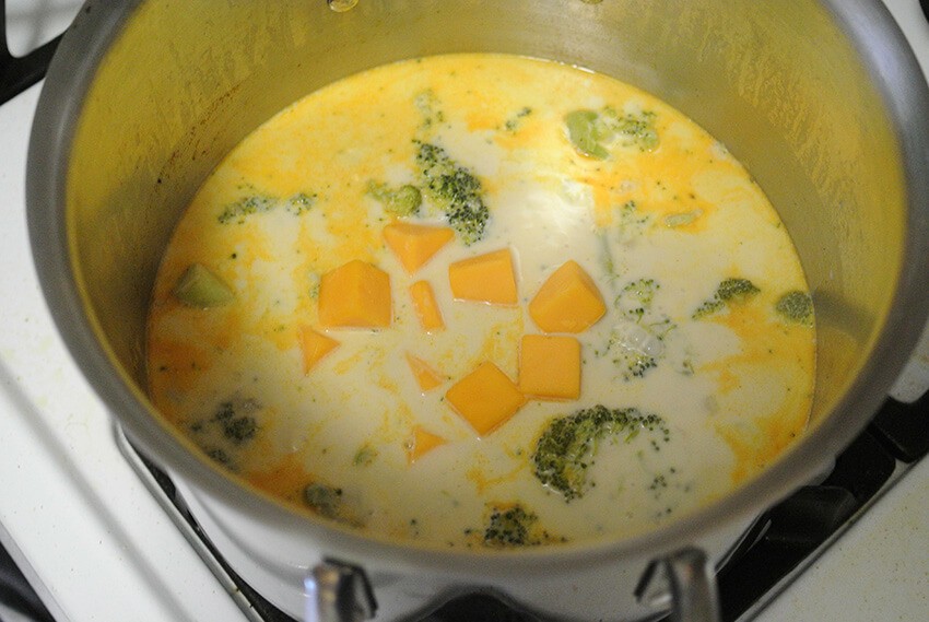 - Once the broccoli is cooked, add 8 oz. of cheddar cheese and stir until it is melted through. We used cubed cheese, but shredded would work better as it will melt a bit faster.